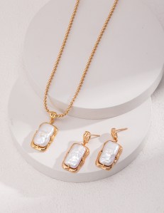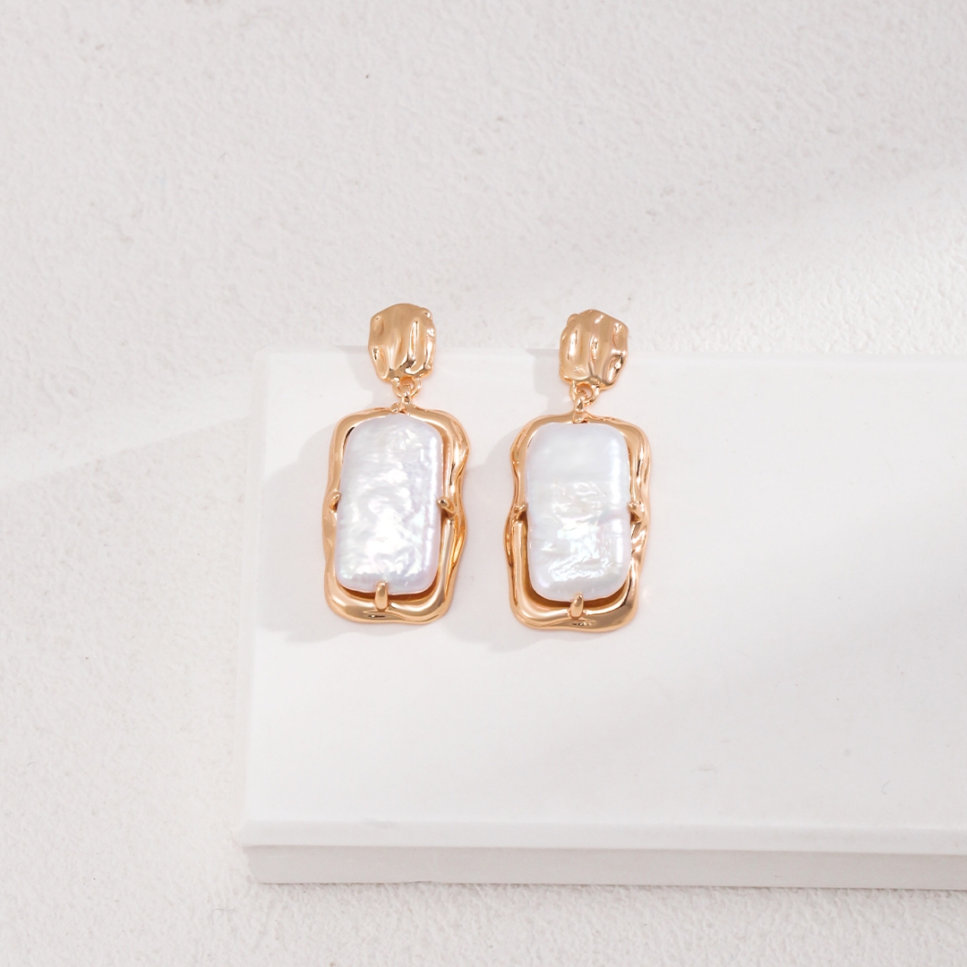 This pair of earrings features striking rectangular Baroque pearls, known for their unique, irregular shapes and lustrous glow. The pearls are set in elegant golden frames, which mimic natural textures, giving the design an organic feel. The tops of the earrings showcase a sculptural design, adding to the overall artistic flair of the piece. The…