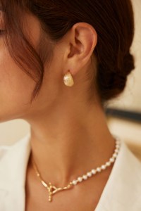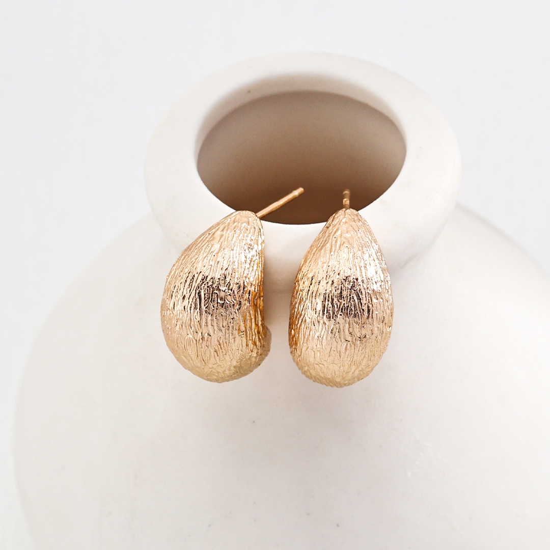 These earrings are minimalist and sculptural in design, featuring a textured surface that resembles organic, slightly rough textures. The design is bold yet elegant, with each pair featuring a crescent moon shape. The textured finish adds a natural, earthy feel, enhancing their visual depth and charm. The earrings’ form is thick and curved, making them…