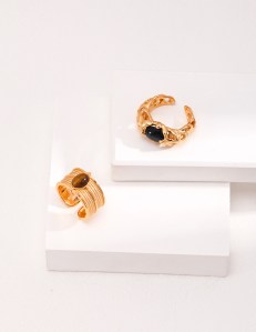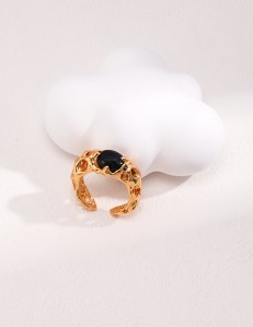 This ring features a minimalist yet elegant design with a strong French-inspired aesthetic. The band has a luxurious, textured gold finish that gives it an organic, almost sculptural feel. At the center, a polished black onyx stone is set, creating a striking contrast with the golden band. The overall look is refined and understated, allowing…