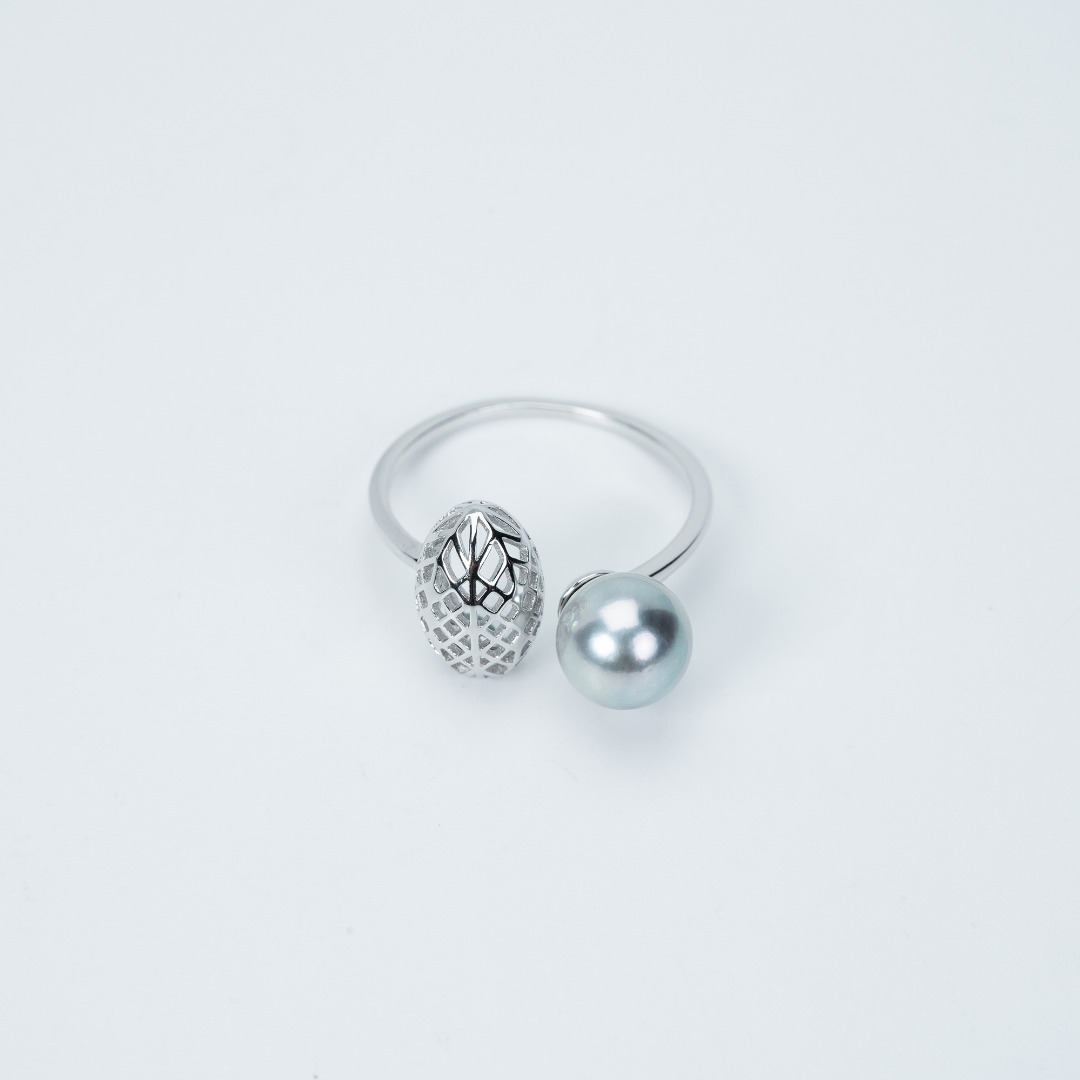 This elegant ring features a sleek, minimalist design with an Akoya pearl on one end of the open band and a silver element on the other, designed to resemble a oval hollow silver bead. The pearl has a luminous, cold-light glow that contrasts beautifully with the intricate hollow bead design, which adds a touch of…
