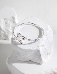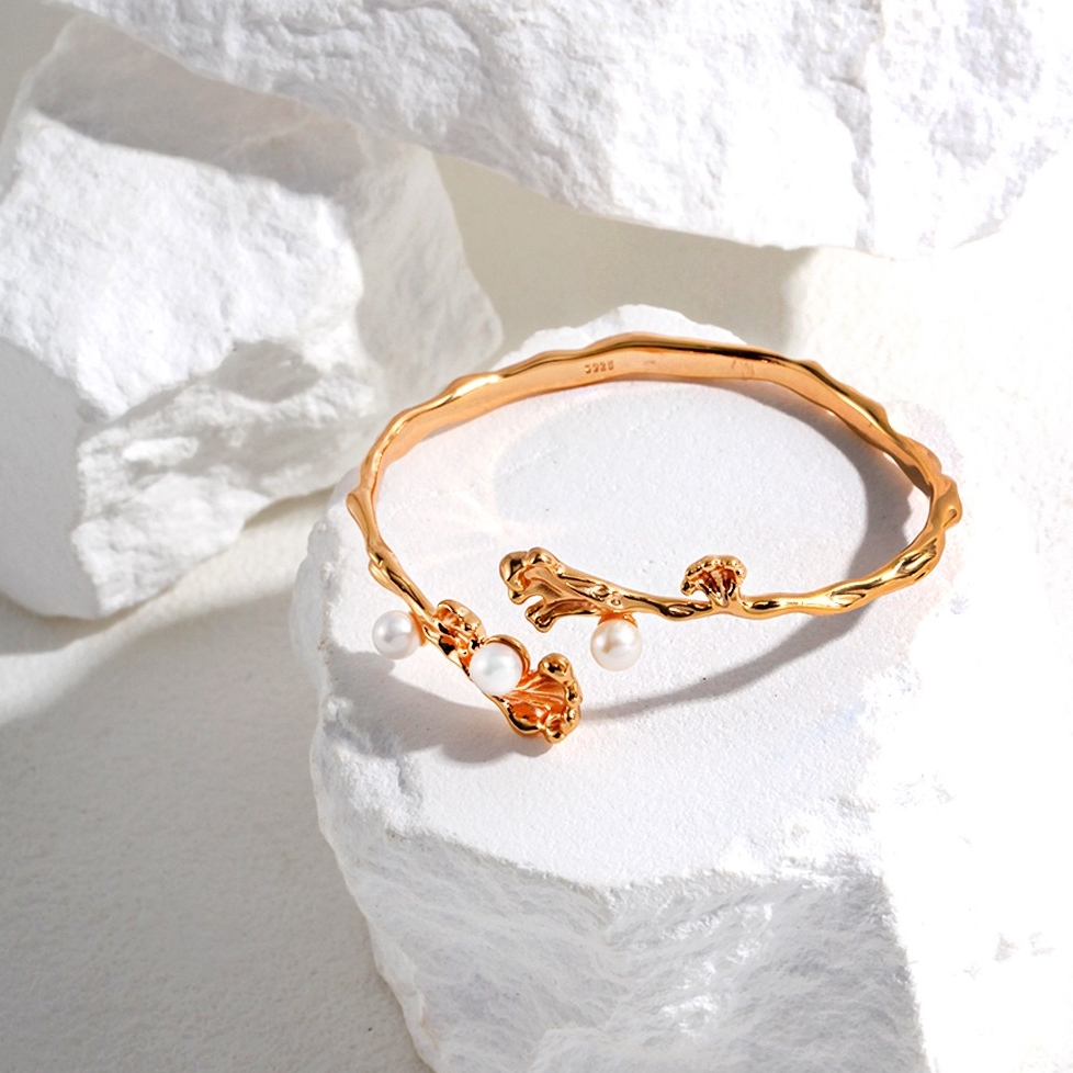 This bracelet is from the Wave-Inspired Series. Waves rise and fall, with the sea foam dancing in the breeze. The natural pearl, set within, reflects like a serene moonlit ocean embraced by gentle waves. This piece captures the luminous beauty and delicate romance of the sea.