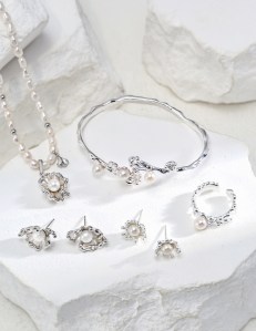This jewelry set is from the Wave-Inspired Series. Waves rise and fall, with the sea foam dancing in the breeze. The natural pearl, set within, reflects like a serene moonlit ocean embraced by gentle waves. This piece captures the luminous beauty and delicate romance of the sea.